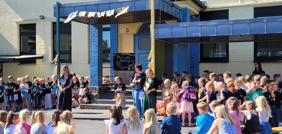 Bei strahlendem Sonnenschein konnte die Einschulungsfeier auf unserem Schulhof stattfinden. Nach der Begrüßung durch Frau Schäfer und der Vorsitzenden des SEB nahmen die Kinder der anderen Schuljahre unsere " I-Dötzchen" mit Gesang und Flötenspiel in Empfang. Danach gingen sie mit ihren Klassenlehrerinnen zu ihrer ersten Unterrichtsstunde.