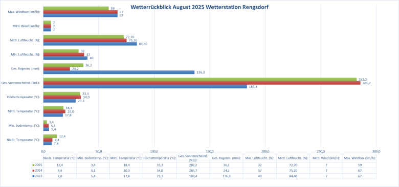 Am 13. August 2025 wurde mit 33,3 °C die höchste Monatstemperatur gemessen. Wie die Ansicht zeigt, lag die mittlere Temperatur etwas unter dem Vorjahreswert.