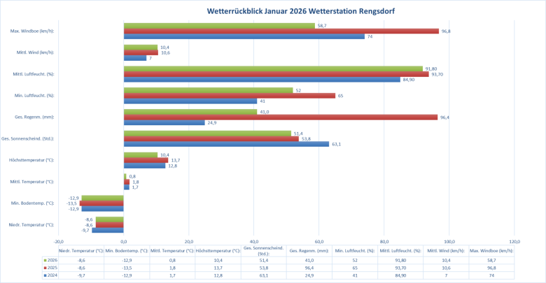 Wie die Übersicht zeigt, war es im Januar 2026 jährlich kühl wie im Vorjahresmonat. Die Niedrigste Temperatur wurde am 11.01.2026 mit -8,6 °C gemessen. Am 16.01.2026 wurde die Höchste Temperatur mit 10,4 °C aufgezeichnet.