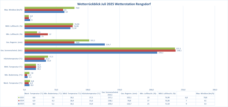 Die Mittlere Monatstemperatur betrug 18,1 °C. Die gemessene Minimum Bodentemperatur wurde mit 7,9 °C am 05.07.2025 aufgezeichnet. Die diesjährige Niedrigste Temperatur betrug 8,8 °C und wurde am 10.07.2025 gemessen.
